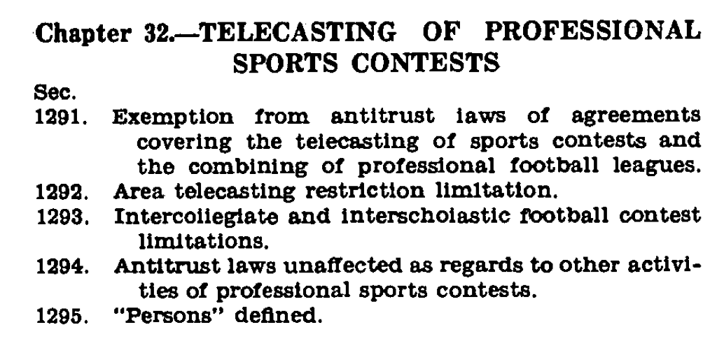 The legislation allowed the NFL (and other major leagues) to merge every team’s broadcasting rights and sell them together to TV networks like NBC and CBS. But at the same time Congress, thanks in part to NCAA-led lobbying efforts, accounted for the damage a unified NFL behemoth could do to high school and college football.