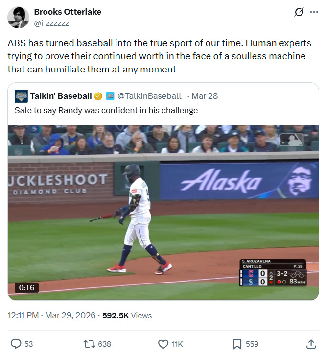 What Made Me Laugh 🤡: MLB has made a number of major changes in the last few years and has been widely praised for most of them. This year’s shift was the introduction of the Automated Ball-Strike System (ABS), which allows players to challenge an umpire’s call by reverting to the robots. It’s basically the tennis challenge system for baseball, and it’s also opened to largely positive reviews.