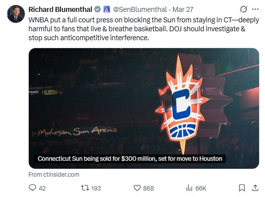 What I Can Explain 🏀: This morning the WNBA formally announced that the Connecticut Sun would be purchased by the owner of the Houston Rockets for about $300 million and moved to Texas. We’ve known this was the league’s preference for months now, despite the outcry from Sun fans and local politicians. But it has drawn new controversy because two different investors well-known to the NBA offered more money to keep the team in the Northeast.