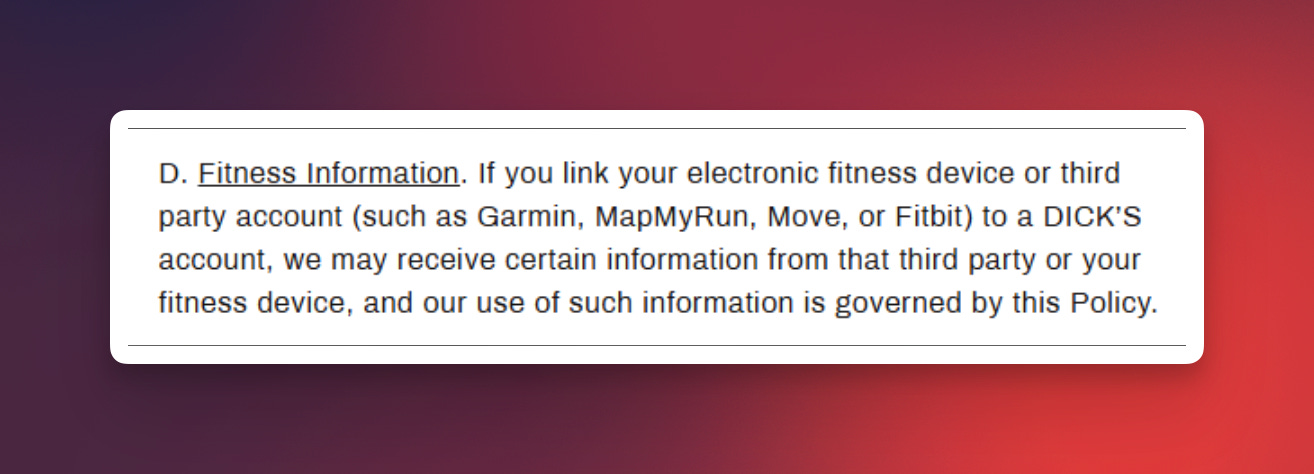 The Dick’s privacy policy appears to have just one very vague line about user fitness data 👇