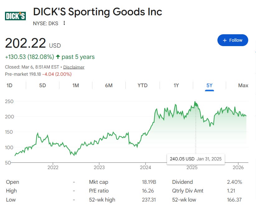 The data emphasis is blend of those two initiatives. It both expands people’s definition of Dick’s, and it bolsters a revenue stream beyond the selling of t-shirts and soccer balls. The stock market has been volatile over the last few years, but Dick’s has been a strong performer. Shares (NYSE: DKS) are up nearly 3x in the past five years 📈