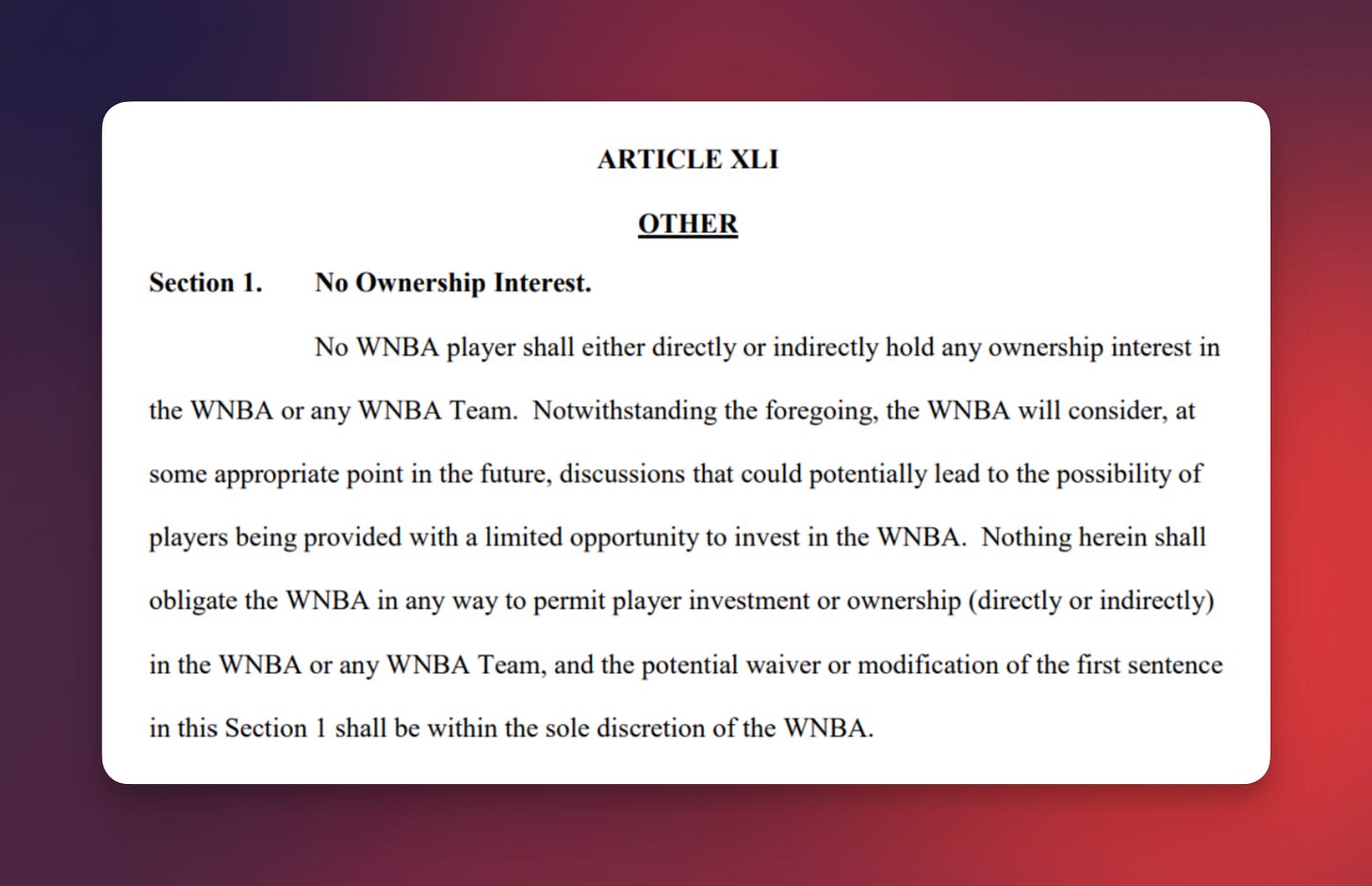 The answer was no. But it became a topic of discussion as they worked towards a labor contract, and while Article XLI, Section 1 of the CBA explicitly says players can’t own equity, it also includes a notable second sentence. “The WNBA will consider, at some appropriate point in the future, discussions that could potentially lead to the possibility of players being provided with a limited opportunity to invest in the WNBA.”
