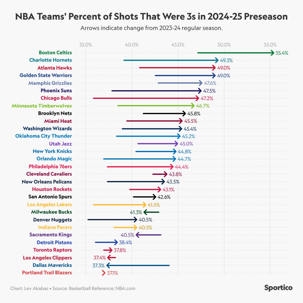 Story of the Week 🏀: Only the Celtics averaged at least 15 made three-pointers per game last season. Through two nights of the current campaign, eight teams are above that mark, while Boston pushed things to another level, tying the NBA record with 29 three-pointers (they did so with nearly nine minutes left in a blowout!). Lev Akabas broke down how and why basketball’s latest revolution is far from over.