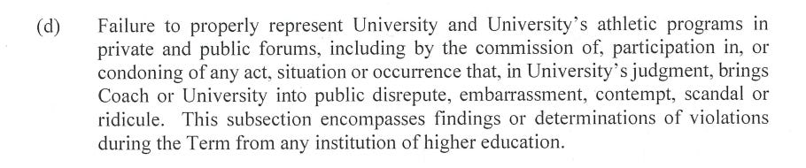 The university used that rant as a grounds to fire Tang for cause, claiming he violated the terms of his contract and therefore shouldn’t receive his $18.7 million buyout. The section that the school claims justifies that move is a very boilerplate morals clause that references anything that brings “public disrepute, embarrassment, [or] ridicule” to the university.