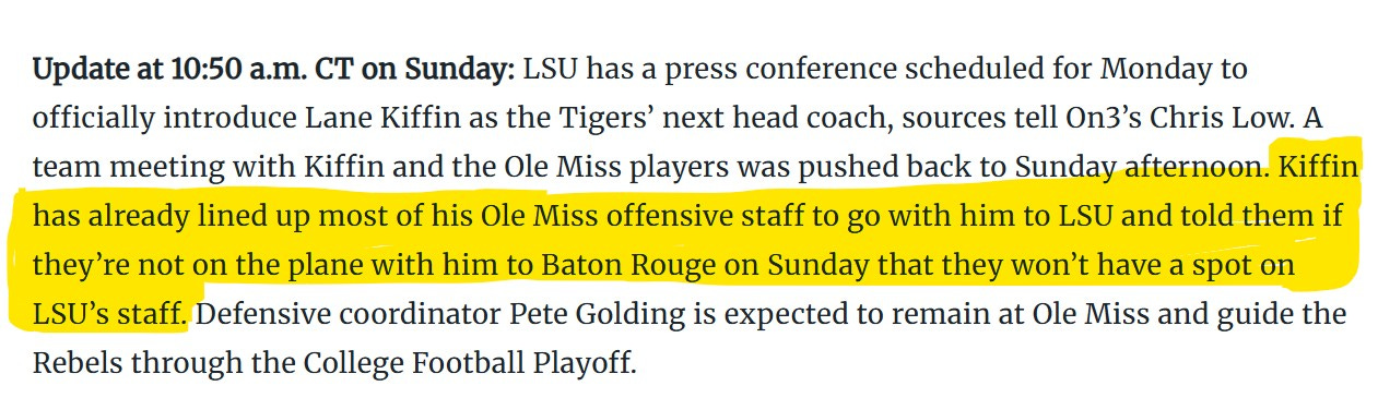 The airport sendoff 🛫: The outcry has been swift from across college football. It’s not that Kiffin quit on the No. 7 team in the country, it’s how Kiffin quit on the No. 7 team in the country. After he failed in his attempt to stay on through the end of the season, Kiffin reportedly forced the rest of his staff to decide that day whether to stay at Ole Miss or join him in Baton Rogue.1 Here’s On3’s report 👇