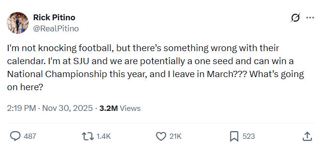 The 30,000-foot takeaway 📈: I know I sound like a broken record here, but there was something very… NFL about how this all played out on Sunday.2 There were no college football games on the schedule, but the sport still dominated headlines and social media. The NFL’s spot as U.S. Sports King™️ is definitely secure, but college football is quickly separating itself as a clear No. 2.