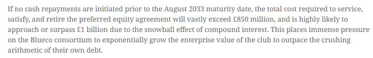 It’s worth a full read, but in short, Chelsea’s massive uptick in spending—which is yet to really produce on the field—is backed by a very risky financial loan that the team chose to structure with a payment-in-kind (PIK) mechanism. Instead of paying down the debt via set interest payments, the soccer club is adding the interest to the outstanding principal balance, which creates what Quinn calls “a deferred but mathematically explosive liability.”
