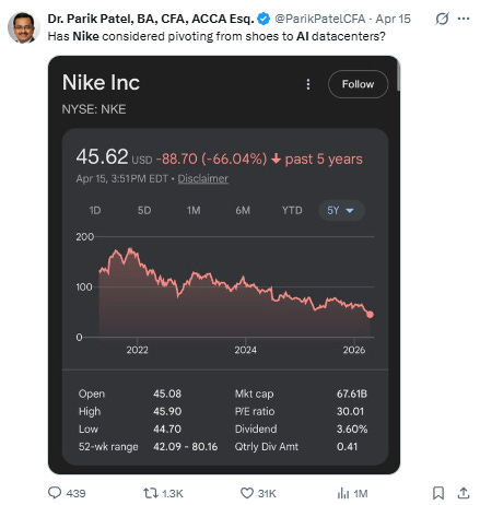 What Made me Laugh 👟: Last week Allbirds, a once-hot sneaker startup, announced it was fully pivoting its business. It will no longer make the soft, trendy cloth sneakers that made the company worth—briefly, more than $4 billion.2 Instead it raised money to pivot to AI computing.