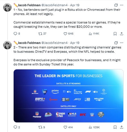 Sportico Thread of the Week 📺: On Saturday, Jacob took to Twitter to explain a question that’s bubbling up more and more as sports streamers secure rights to major sporting events—How do bars handle games on Netflix, YouTube, Apple TV or Prime Video? Turns out it involves two main competitors, fire code occupancy, special training and, and of course, a private equity firm. Here’s a snippet3 👇