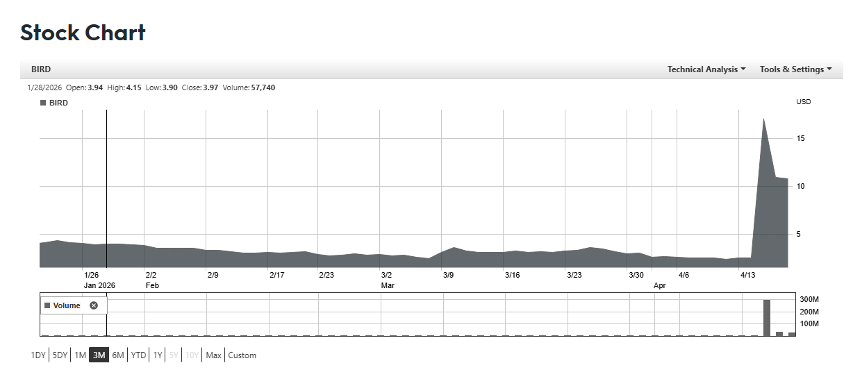 Speaking of stock charts, the market has (so far) loved Allbirds’ new move. Here’s the (Nasdaq: BIRD) three month price movement 👇