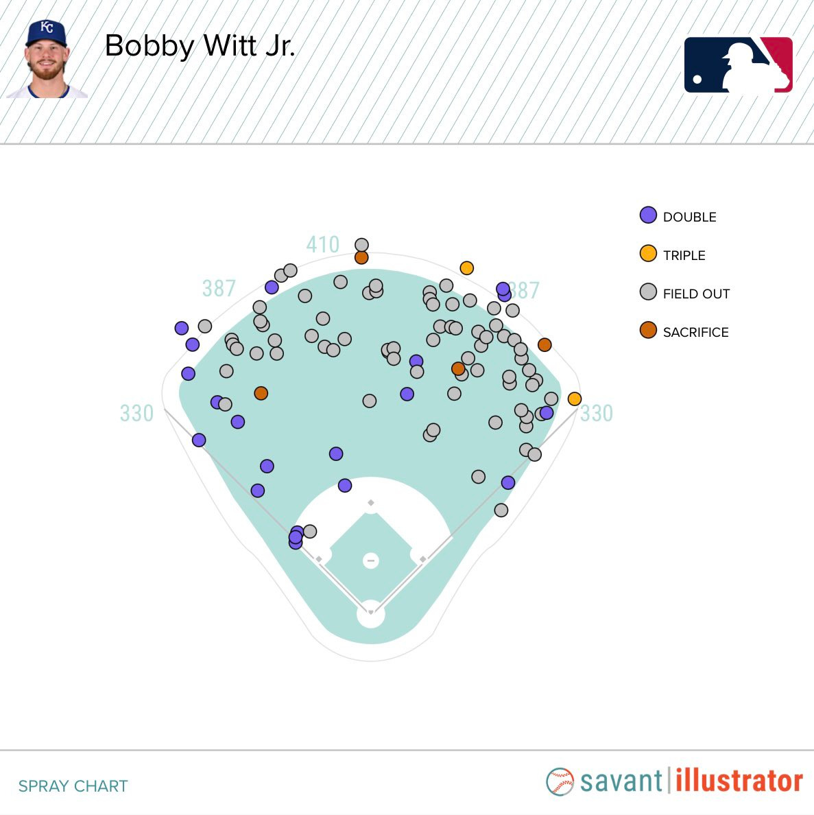 On offense, Royals teams have typically been built around contact hitters and speed—necessities given the cavernous home stadium—but 25-year-old star shortstop Bobby Witt Jr. has pop, as does first baseman Vinnie Pasquantino and a few of their biggest prospects. Look at Witt’s spray chart of line drives and fly balls at home last season. You can see the impact this might have.