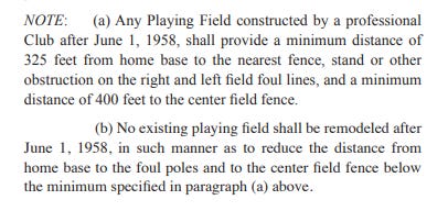 The answer, technically, is nothing (!). Major League Baseball’s 191-page rule book is light on guidelines for the dimensions of the outfield. The centerfield wall must be at least 400 feet from the plate, and the rest of the outfield wall must be at least 325 feet. That’s for venues built after 1958, which allows stadiums like Fenway Park to get away with its 302-foot right field fence.