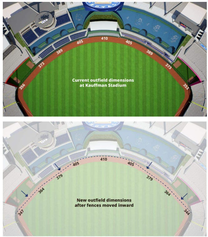 I won’t lay out all the specifics—here are two good stories if you’re curious—but in short, Kauffman Stadium is notoriously unfriendly to sluggers, and after years of watching well-hit balls caught on the warning track, Picollo asked Royals owner John Sherman for permission to explore a change. He then asked assistant GM Daniel Mack, who has a Ph.D. in computer science and a master’s degree with a concentration in machine learning, to crunch as many numbers as possible.