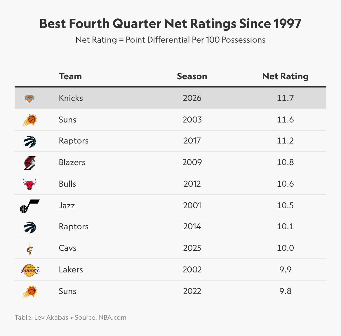 Led by Jalen Brunson and his crunch time reliability, the Knicks had the best fourth quarter net rating of any NBA team in the play-by-play era. I can’t say that this list below contains a meaningful collection of teams, but in a season that felt very “blah” for the Knicks, it’s something!