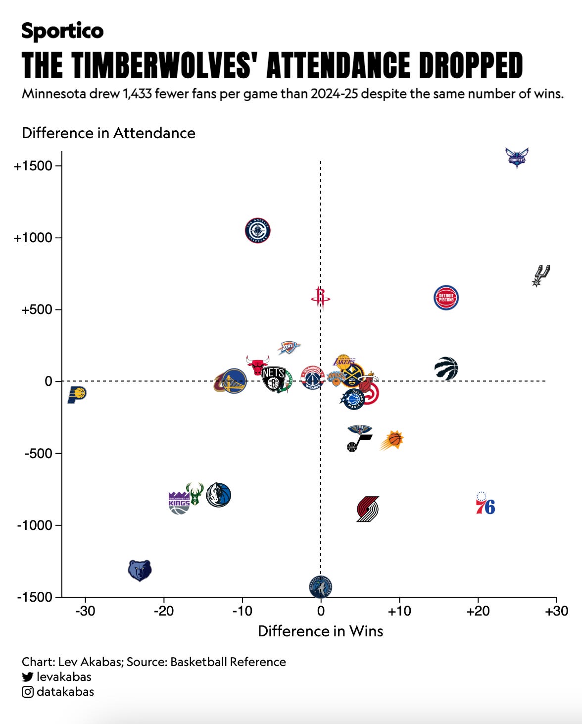 The Timberwolves won the same number of games as they did last season, when they reached the Western Conference Finals, but vibes are down. Their attendance dropped more in 2025-26 than any other team, and DraftKings gives them just 100-to-1 odds to win the title.