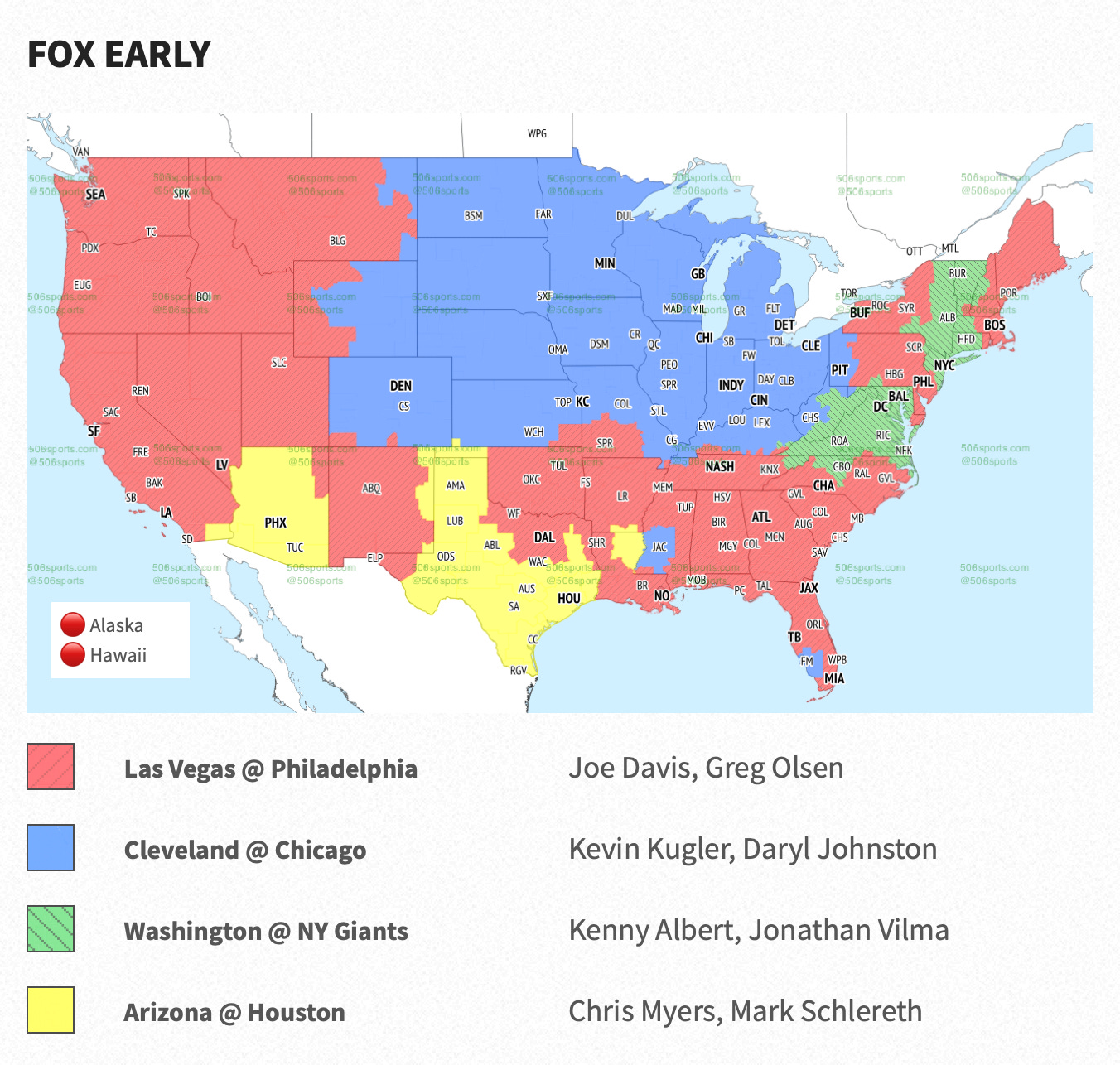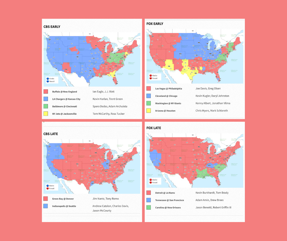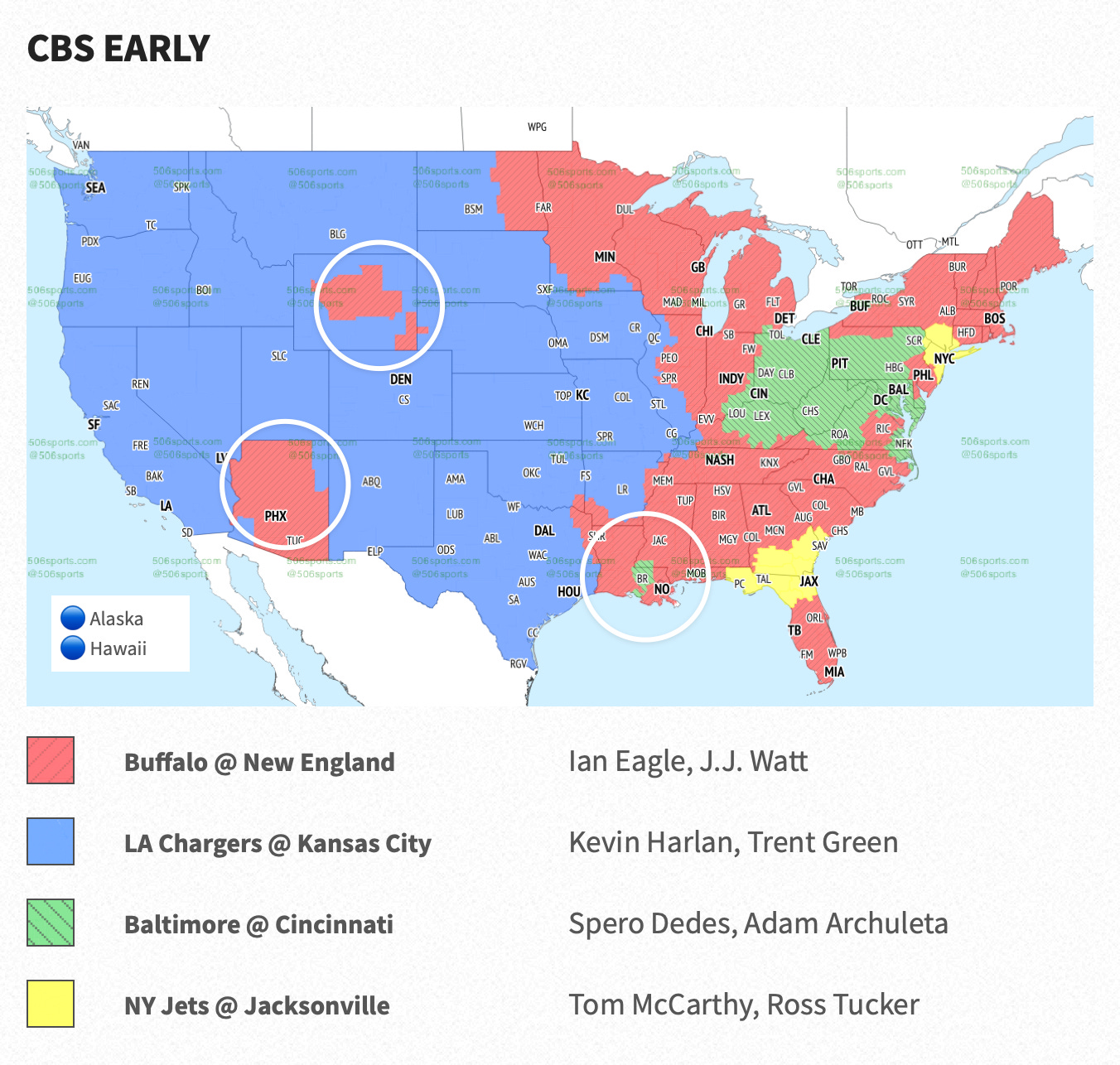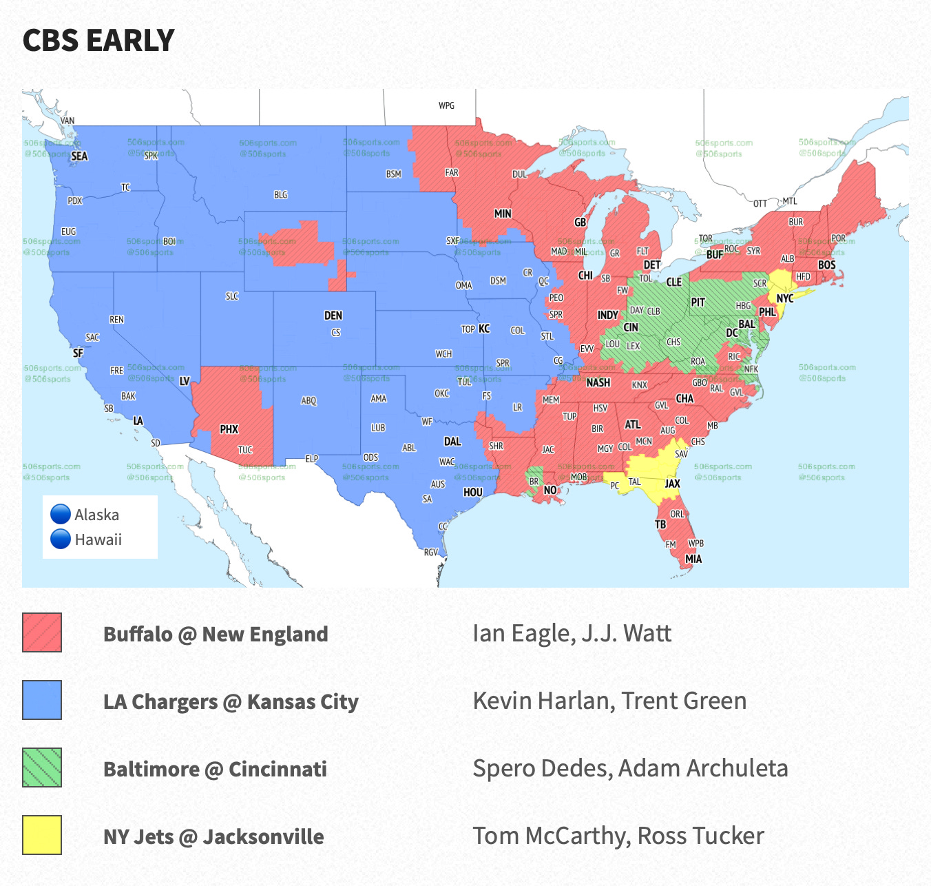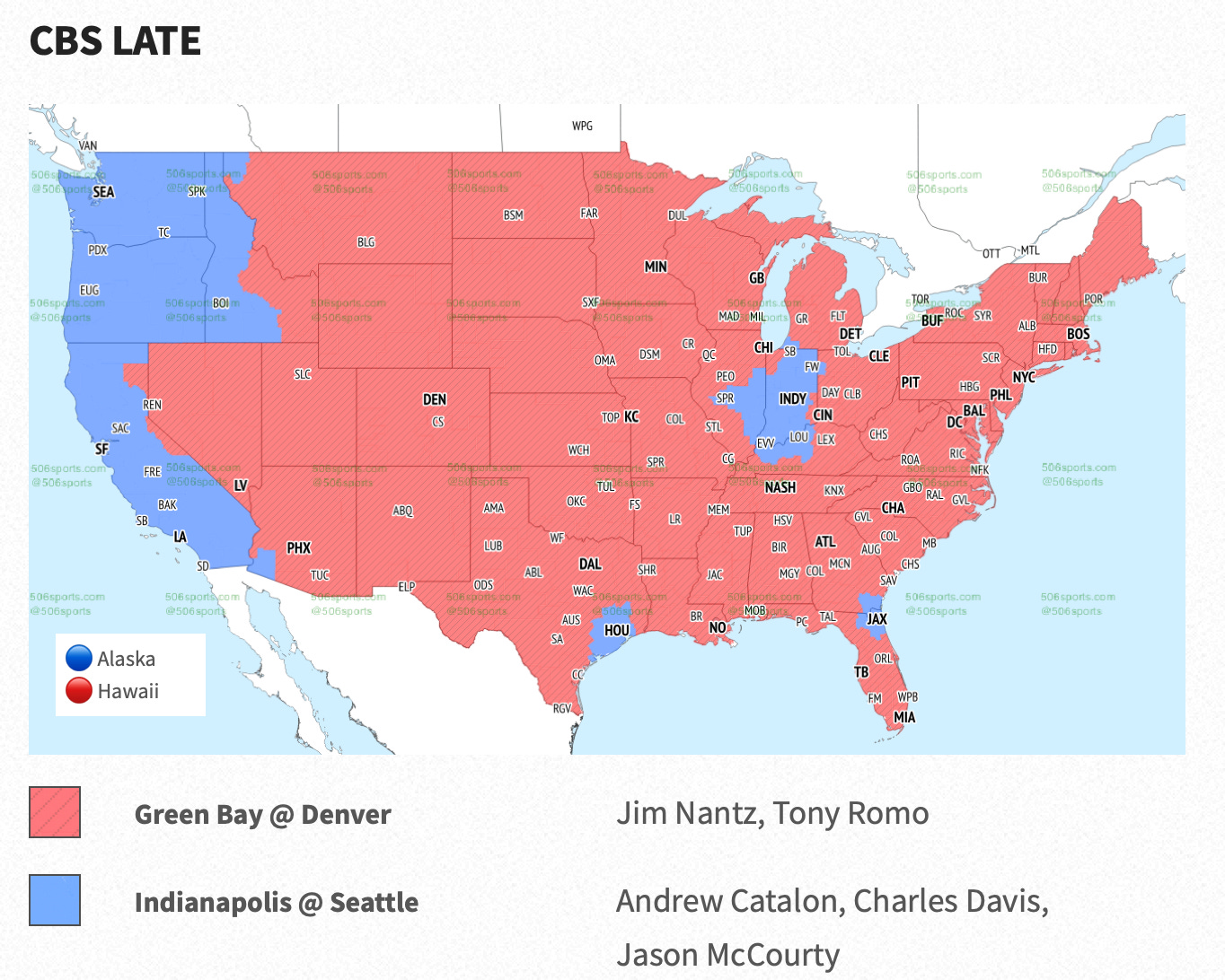 CBS’s second window is only slightly more involved, with Seahawks/Colts airing in most of the NFC West and AFC South’s core footprint while others get Packers/Broncos.