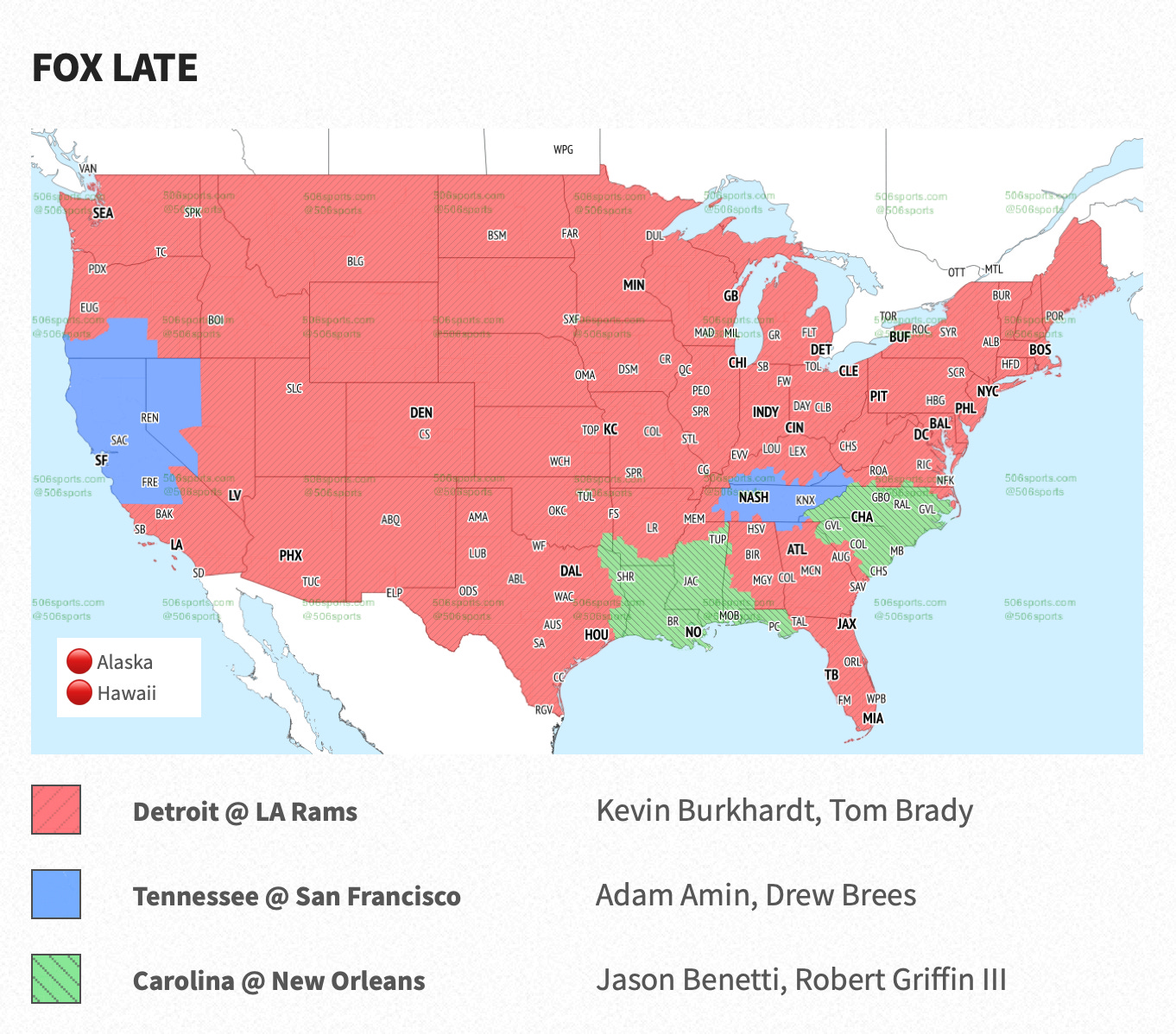 Panthers/Saints and 49ers/Titans air regionally, while the rest of the country is treated to Lions/Rams.
