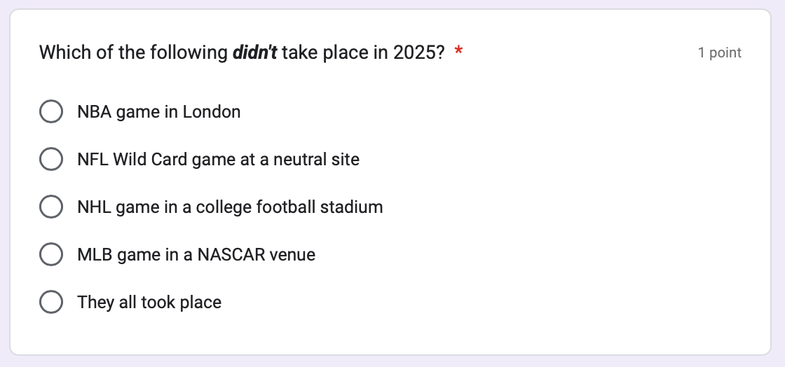 Sportico Story of the Week🏅: Thanks to everyone who took our year-end news quiz. The test is still open if you missed it, but shout-out to the anonymous respondent who got 18 of 25 correct. That was our top score! Logan and Isaac tied with 16 apiece among named quiz-takers. Congrats!
