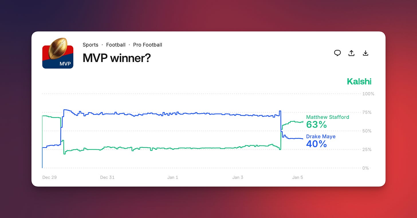 What Confused Me ❓: Speaking of opaque, QB-related metrics, what’s going on with this year’s MVP race? Over the last seven days, Drake Maye surpassed Matthew Stafford as the odds-on favorite, only to lose frontrunner status on Sunday after both QBs had strong performances. What’s going on here?
