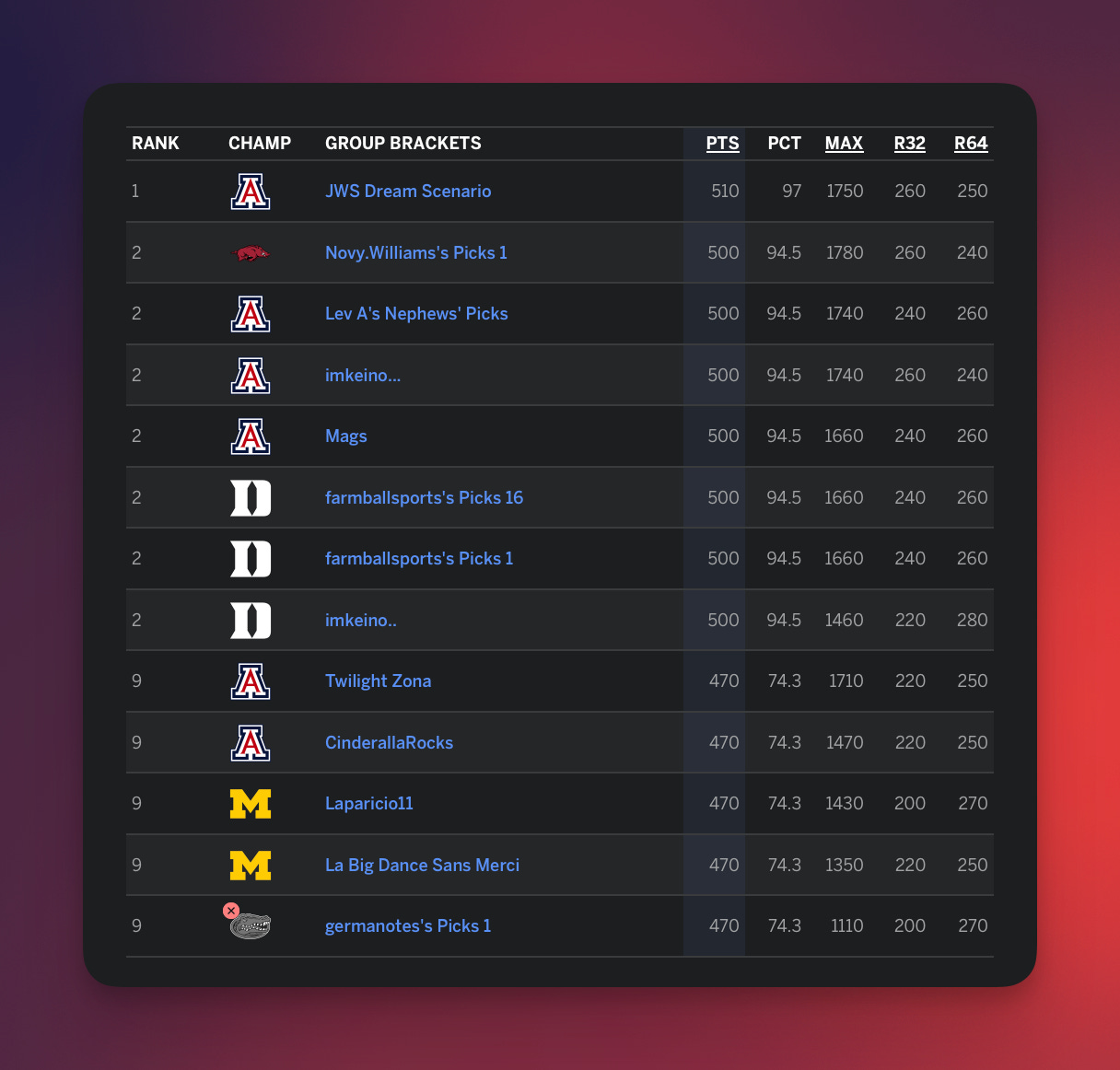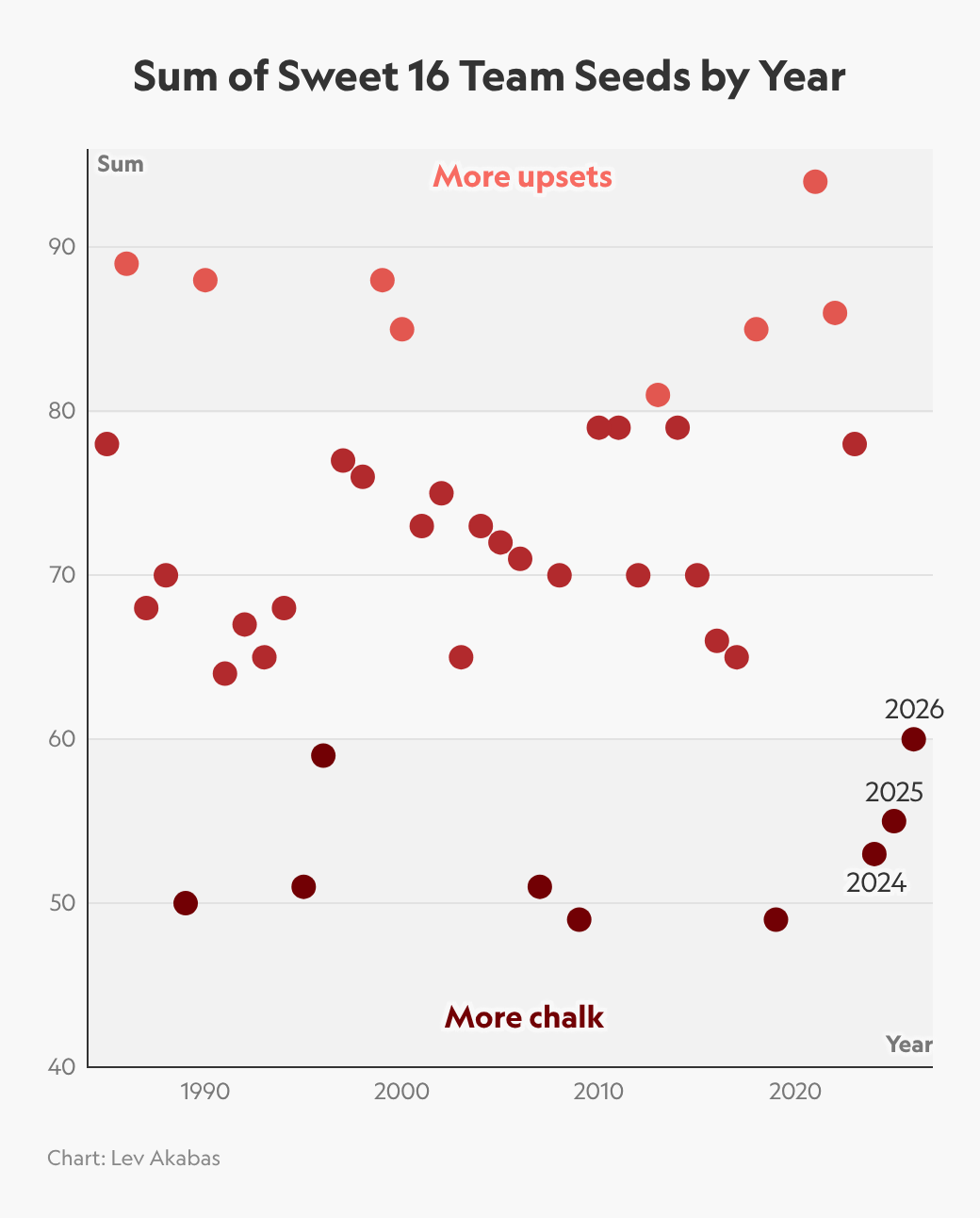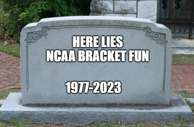 I’m4 honestly pretty tired of that discourse, but I’ve always been confused about how the deeply-flawed bracket challenge became the default version of March Madness office pools, and I do wonder if that process will look even sillier in a future where there are far fewer upsets. You either pick chalk and do well (but despise yourself) or you pick fun and lose. There’s really no winning.