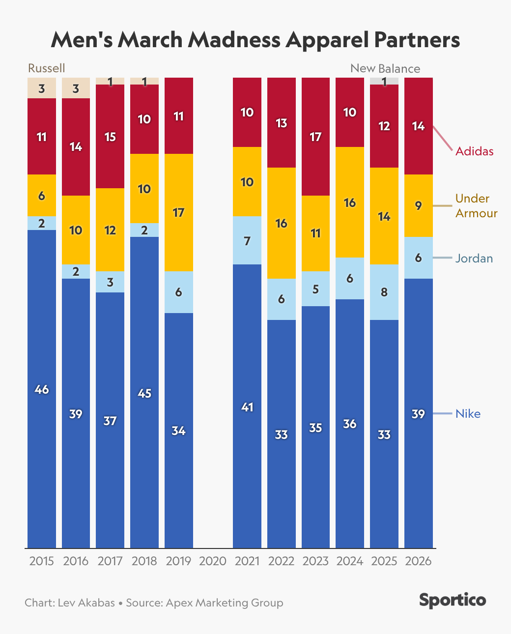 What We’re (Not) Wearing 👟: Under Armour has dramatically scaled back its sports marketing spend in the last half decade, including the termination of many of its college sports partnerships.1 Until this year, however, that change had not been reflected in the company’s March Madness presence, where the success of a few teams covered the fissures in the overall portfolio.