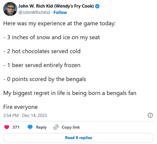 Non-Sportico Story of the Week ❄️: In sub-freezing temperatures on Sunday, Cincinnati Bengals fans showed up to Paycor Stadium to find snow and ice covering most of the seats. The Cincinnati Enquirer does a good job of breaking down the absurdity that ensued, including an interview with a county commissioner who was there and another fan who said her section was given a plastic container to scrape off the ice. The team’s response was “seats are easily wiped off,” a wholly unacceptable answer for a team whose venue just received $350 million in public money for renovations.1