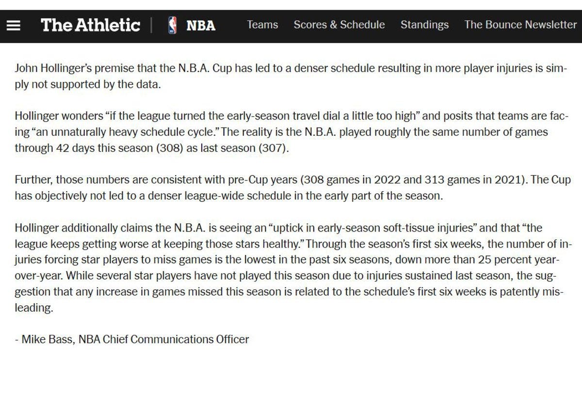 What I Don’t Understand❓: Two weeks ago, The Athletic‘s John Hollinger wrote a column about the toll that increased travel has taken on NBA players. It’s a subject that’s top of mind for both players and fans amid what appears to be an increase in high profile injuries. On Thursday, the league fired back on X in a very bizarre way. Top comms executive Mike Bass took issue with Hollinger’s assertions, but wrote his response with the header and font of a fake The Athletic story. What is going on here??