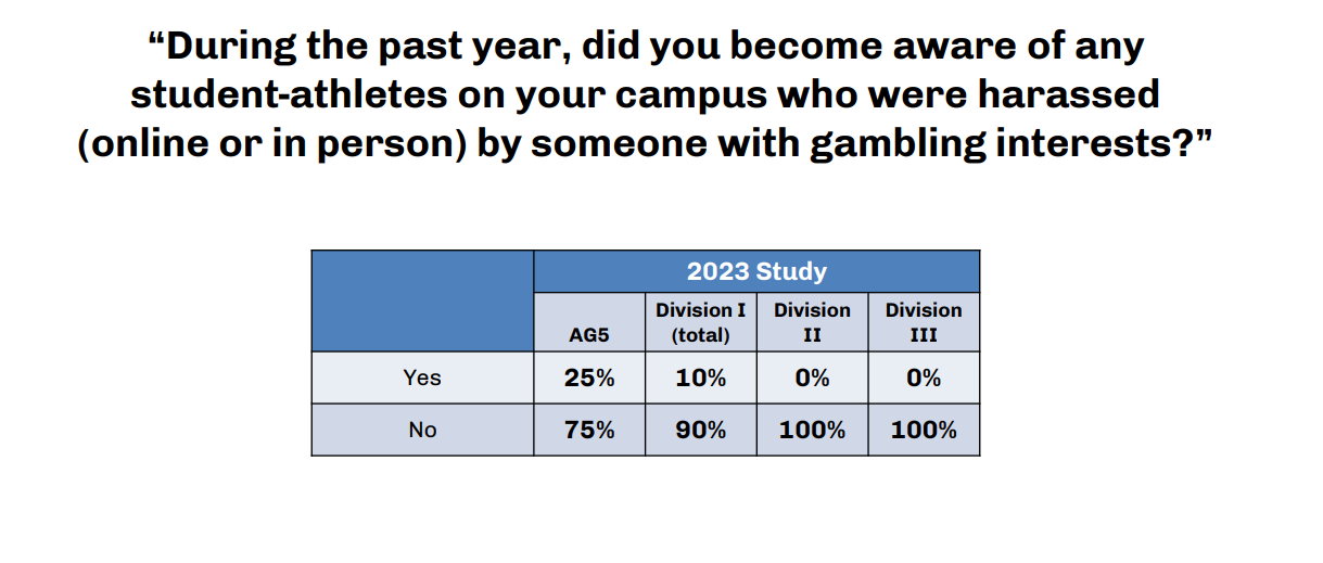 In a 2023 survey of athletes, the NCAA found that 25% of “Power 5” conference athletes and 10% of DI athletes were aware of harassment from people with gambling interests.