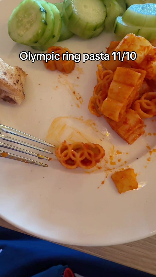 Olympians are still limited in what they can broadcast from athlete-only areas, but the food hall is fair game once again. So far, the star of the show has been Olympic Rings-shaped pasta.